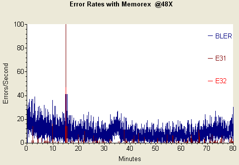 BLER (Block Error Rate) is defined as the number of data blocks per second that contain detectable errors, at the input of the C1 decoder. Since this is the most general measurement of the quality of a disc, you will find BLER graphs for all media tested below. If you click on the images you can see a more detailed table, indicating error levels.