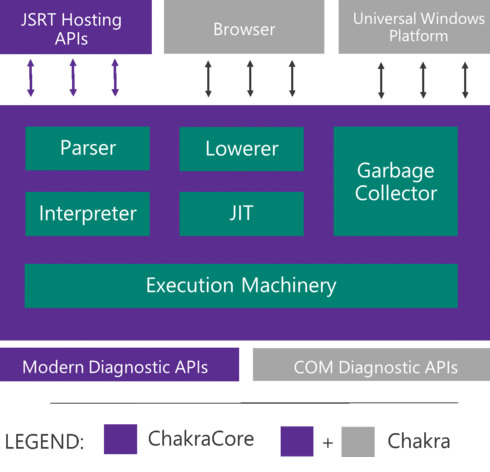 ChakraCore shares the same set of capabilities that are supported by Chakra in Microsoft Edge, with two key differences. First, it does not expose Chakra’s private bindings to the browser or the Universal Windows Platform, both of which constrain it to a very specific use case. Second, instead of exposing the COM based diagnostic APIs that are currently available in Chakra, ChakraCore will support a new set of modern diagnostic APIs, which will be platform agnostic and could be standardized or made interoperable across different implementations in the long run.