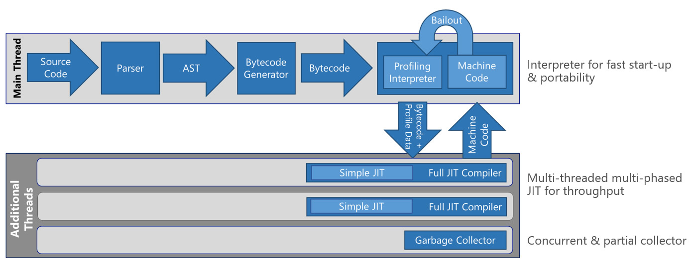 Chakra features a multi-tiered pipeline that supports an interpreter, a multi-tiered background JIT compiler, and a traditional mark and sweep garbage collector that can do concurrent and partial collections.