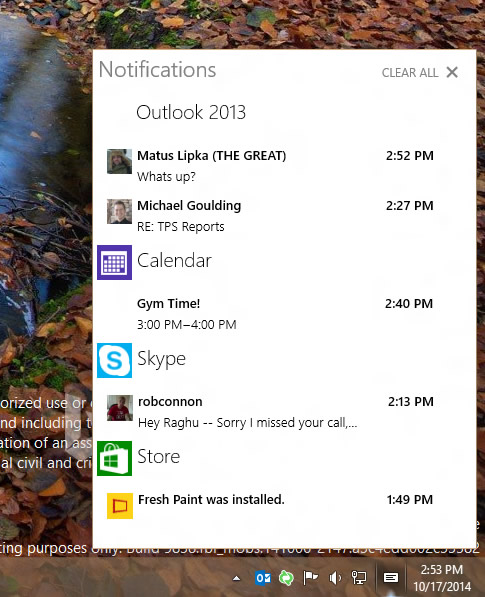 With this build, Microsoft is bringing "Action Center" from Windows Phone over to the PC as the place where you can see and follow up on all actionable items. This build is focused only on enabling basic notifications – quick actions and cleaner UI will come later. You’ll see notifications from the system and apps – from new emails and invites to IMs, Facebook posts and more – all in one place.