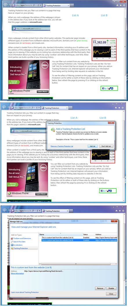 These lists include Web addresses for IE to treat as "Do Not Call" unless the consumer visits the address directly. The lists also include 'OK to Call" addresses to make sure that the user can get to these addresses even if one of their lists has it as "Do Not Call." Once the consumer has turned on Tracking Protection, it remains on until the person turns it off. Again, it?s worth noting that consumers have to turn on Tracking Protection and that by default IE9?s privacy protections are similar to IE8?s.