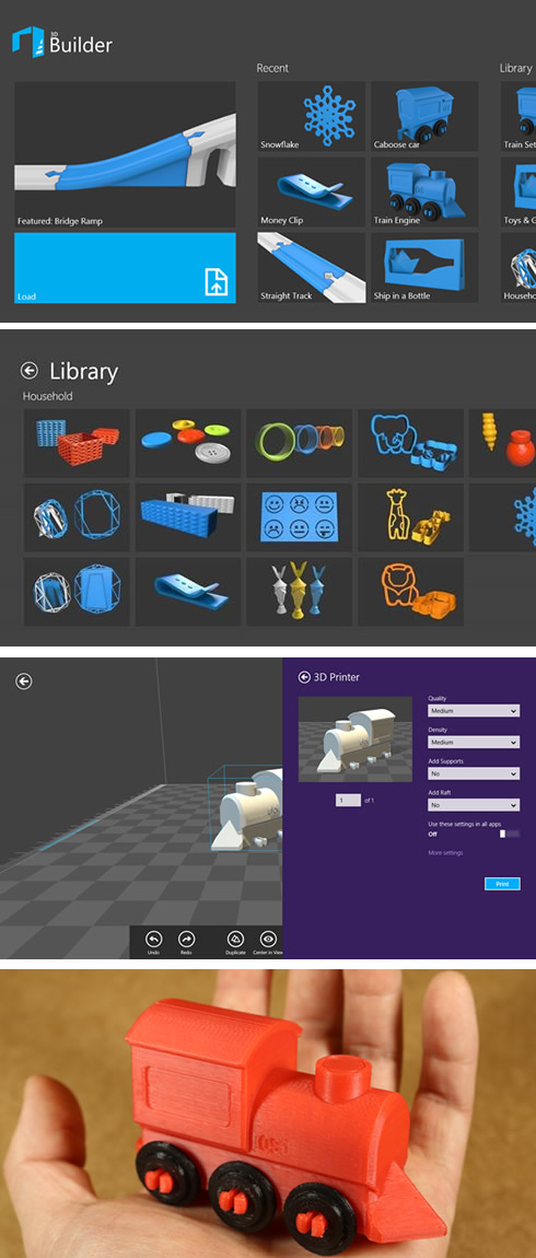 3D Builder has a catalog of objects you can create from ornaments to toys and more. A user interface lets you scale, rotate and adjust what you want to print. Add multiple objects to a single print - even stack or push objects into one another to create new ones. Printing 3D objects created in other applications or ones that are downloaded from the Internet is also supported.