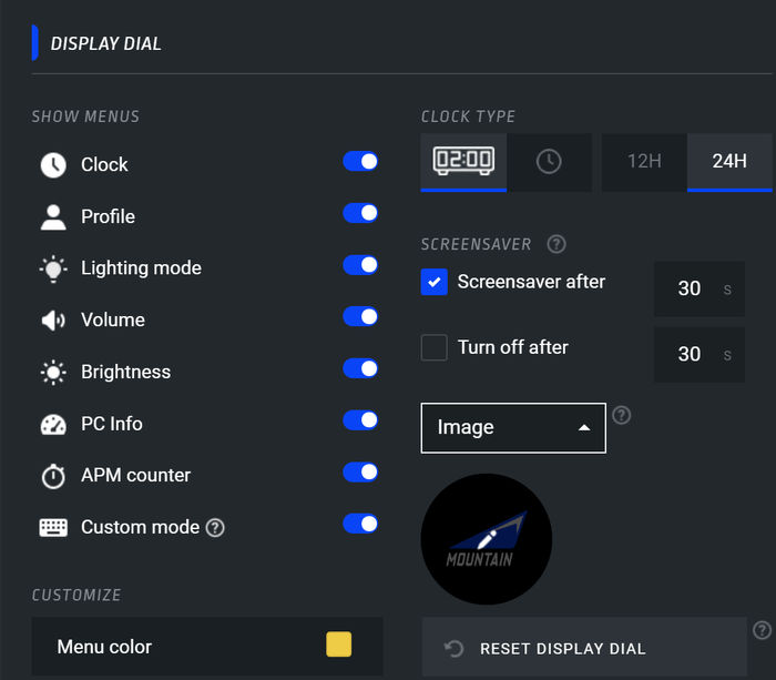 We can remove several menus that are selectable from the display dial or set the clock type (12H/24H) and set the screensaver timer.