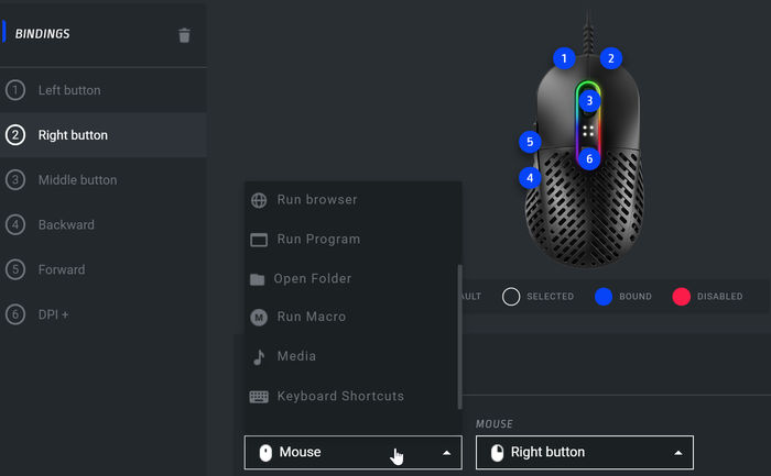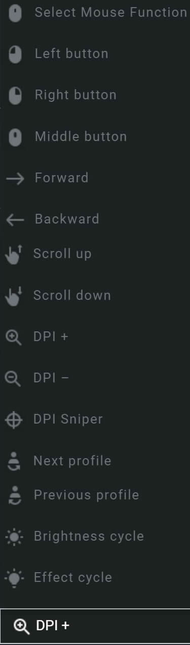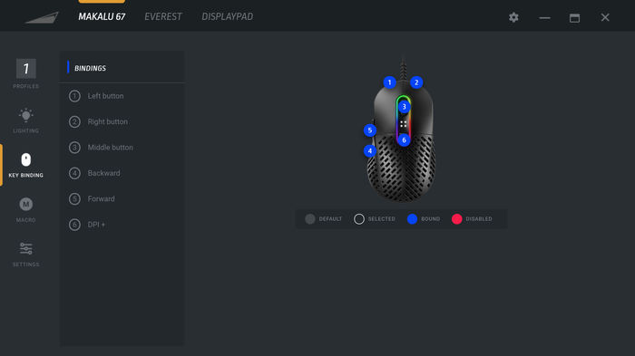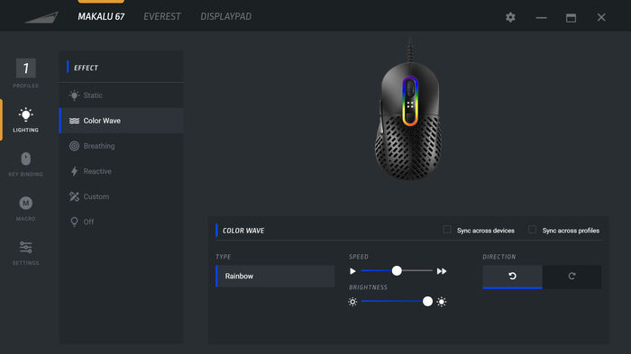 Next product we can set from the BASE CAMP was the MAKALU 67 mouse. The first menu is the profile (you can have one profile for all MOUNTAIN products), next is the lighting effects, there are 5 different profiles (and of course the option to turn lighting off).