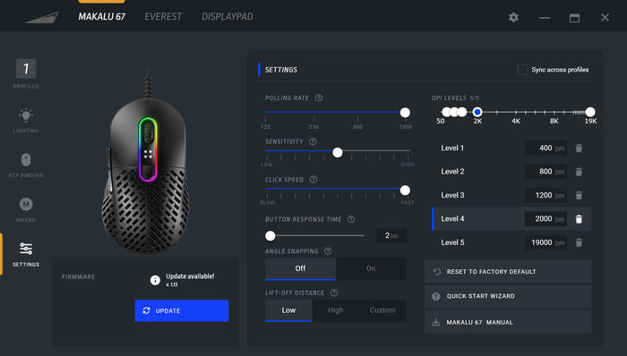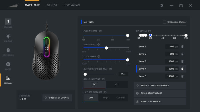 Users can set the polling rate, mouse sensitivity, click speed, button response time, angle snapping, lift-off distance, and of course DPI levels, there are five (5) pre-configured, while users can also set their own DPI levels either from the top bar or by typing dpi values inside each level box.