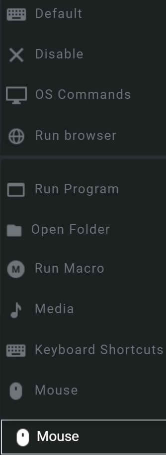 For each button users can set various major functions, and then the corresponding action for that function. Depending on what you have chosen different actions will be displayed/required..