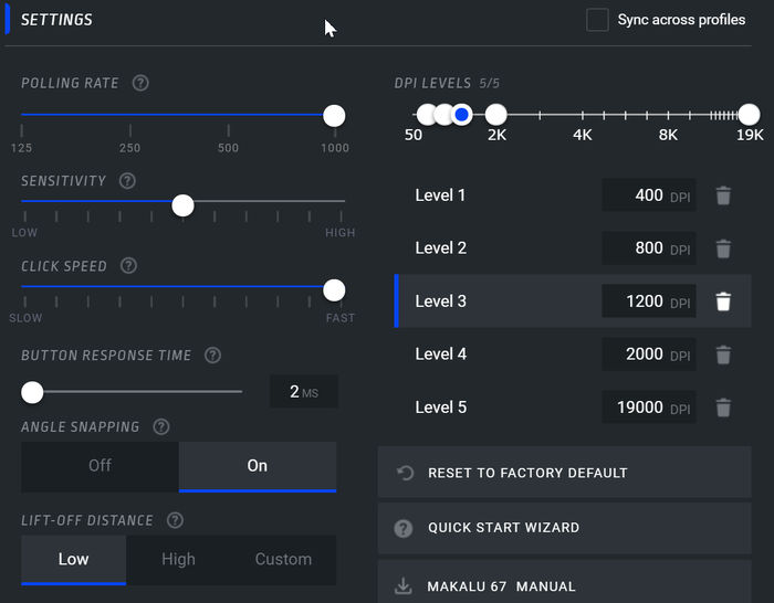 At the settings users can adjust/set the MAKALU 67 mouse according with their likes/needs.