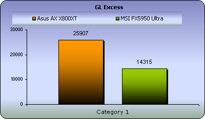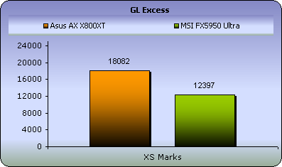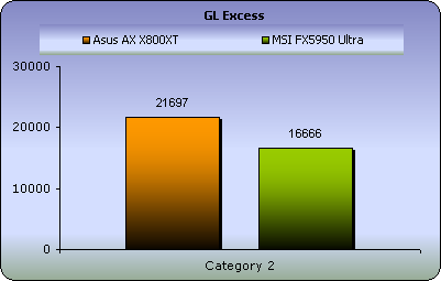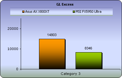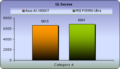 The MSI FX5950 Ultra comes up with an incredible performance in this OpenGL benchmark. If you check out the Category 4 benchmark for multitexturing effects, you'll see an unbelievable chart. There, the FX5950U outperformed the Asus X800XT by a total of 250 marks!