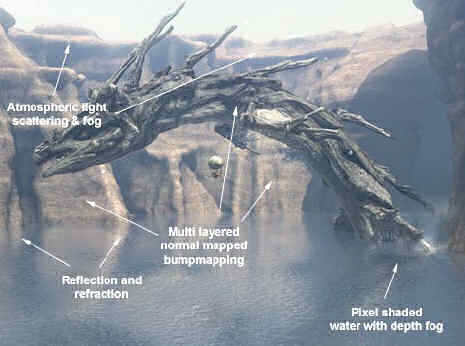This scene is fairly complex with large areas of water reflecting the high canyon walls. The water is actually one of the key points of interest in this scene. The water not only does realistic looking reflections and refractions, it has a depth fog, making the sea monster swimming under the airship appear deep down in the water. The air in this scene also uses a volumetric fog, making distant cliffs in the canyon appear far away.