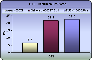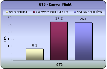 The fps in this game test are relatively low but since the light source is moving slowly across the different scenes, you can't really tell the difference between 15 or 25 fps. The MSI NX 6800 Ultra is still on top regarding performance with the Gainward 6800GT threateningly close behind. Both cards outperformed the X600XT by a factor of 4 to 1.