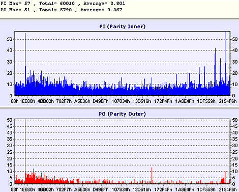 The following screenshots show the PI/PO results for various DVD-/+R and DVD-/+RW media, recorded with the Nec ND-2500A at the maximum allowed speed.