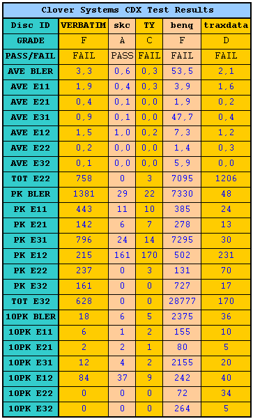 This is the first time we include the following tests in a burner review. The Clover Systems CDX Compact Disc Analyzer is a high-speed tool to quantitatively measure the quality of a CD. It will analyze CD-DA, CD-ROM, CD-ROM XA, CD-I, CD-R, Photo-CD, Enhanced CD and CD-RW discs at 4X, 8X, 24X, 32X or 40X speed. It effectively measures disc quality by examining the quantity and severity of CIRC errors generated during playback. It also provides the capability to measure signal parameters related to pit geometry, such as asymmetry and reflectivity. Together, all these bits of information provide a thorough analysis of disc quality. The Clover Systems Analyzers can also perform various format-checking tests on data discs, and do bit-for-bit data comparison on all types of CDs. All tests are carried out at the maximum speed of 40X.