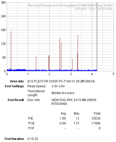 In general, a "perfect" disc should have a smooth reading curve, very low PIE/POE and zero (0) POF error rates. Most times however, even though a disc has very low PIE/POE error rates, the reading curve may not be smooth containing dropoffs. Due to the fact that we oversped the reading capabilities of the LiteON SOHD-167T, such drops are expected, especially near the outer area of the disc.