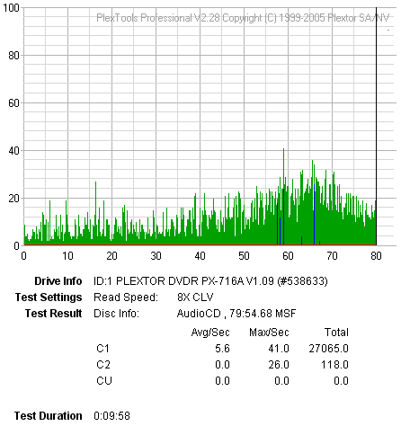 According to the above Plextools scans, two out of four burned media were found to be of very good quality, while the other two burns reported some C2 errors, indicating potential errors in the immediate future.