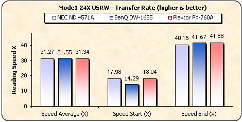 The NEC 4571A proved to be quite a ripper with 13.130 Kb/s, outmatching the Plextor and BenQ drives.
