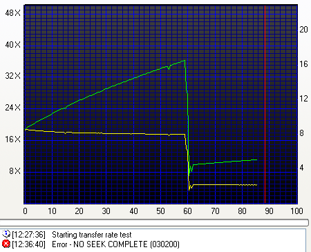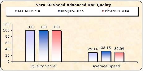 DAE speed is a bit slower with the 4571 always in comparison to the other two drives. As reported by Nero CDSpeed advanced DAE quality, the quality score is a perfect 100 while the average speed goes all the way up to 29.14X. Note here that the test could not be completed, so we failed to verify the Leadin and Leadout as well as the cdtext reading capabilities of the drive...