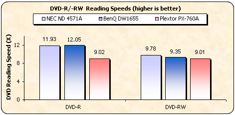 The NEC and BENQ drives managed to read the write once media (both formats) with a max speed of 16X, while the Plextor got all the way up to 12X. With Re-Writable media, the drive managed to achieve a max reading speed of 12X with 9.78X average speed in both cases.