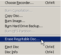 If you are using a rewritable disk and you want to erase it open once the Recorder option from the main bar and choose "Erase Rewritable Disk" from the drop-down menu as bellow.