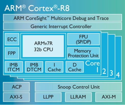 The Cortex-R8 also enables larger tightly coupled memories (TCMs), up to 1MB of instruction TCM and 1MB of data TCM per core. In additional to other benefits the Cortex-R8 can be configured with 12, 16, 20 or 24 memory protection unit regions.
