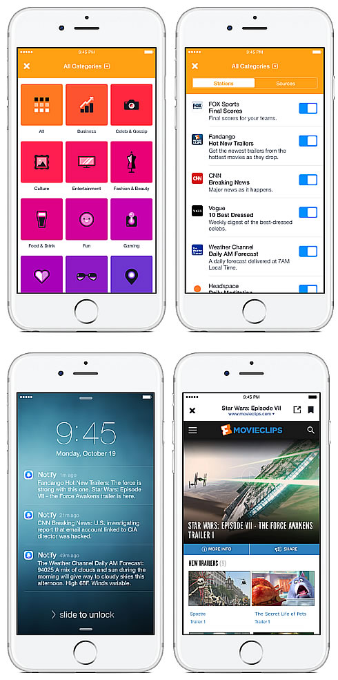 Facebook is introducing Notify, a new app from Facebook that delivers timely notifications about new content from media partners such as Fox News, Washington Post and CBS. The app allows user to share notifications directly from the lock screen and includes a broad selection of "stations" across different categories such as sports, fashion and breaking news.