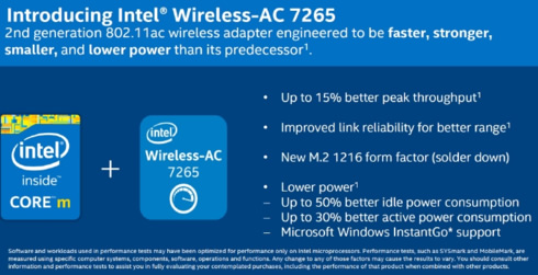 Additional Intel Core M platform features include support for high-quality audio, a new Wireless-AC 7265 2x2 802.11ac component; Wireless Display (WiDi) 5.0, and wireless docking support.
