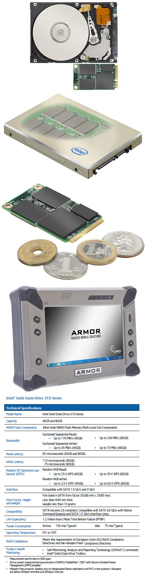With its rugged design, the Intel SSD 310 Series has been chosen by DRS Technologies for a new ARMOR communications tablet PC to be unveiled at Storage Visions in Las Vegas. The ARMOR mobile and field unit tablet PC is certified by DRS to work in extreme temperatures and hold up to shock, vibration and drops, delivering up to nine hours of operating time.