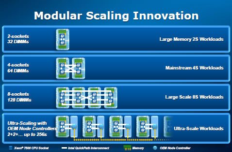 The modular scaling of the Xeon 7500 processor works with the Intel 7500 Chipset and Intel 7500 Scalable Memory Buffers to enable new OEM system designs and brings a wide range of socket, memory and I/O, form factor, and reliability feature sets never before available to the mainstream server market. Enterprise software vendors expected to support the high-end features of Intel Xeon processor 7500-based platforms, include Citrix, IBM, Microsoft, Novell, Oracle, Red Hat, SAP AG and VMware.