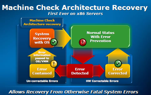 This is the first Xeon processor to possess Machine Check Architecture (MCA) Recovery, a feature that allows the silicon to work with the operating system and virtual machine manager to recover from otherwise fatal system errors, a mechanism until now found only in the Intel Itanium processor family and RISC processors.