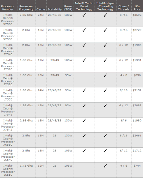 The Intel Xeon processor X7560, with eight cores and 24MB cache size, is built for highly parallel, data demanding and mission-critical workloads, whereas the Intel Xeon processor X7542 is a frequency-optimized 6-core option at 2.66 GHz targeted for super node high-performance computing applications in science and financial services.