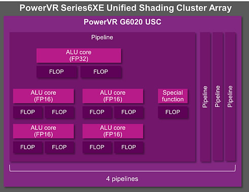 PowerVR G6020 also features a microarchitecture optimized for cost-sensitive devices where area efficiency and a balanced feature set are the main driving factors; the diagram below offers an overview of the area optimizations Imagination Tech has made to the USC (unified shading cluster) architecture for this GPU: