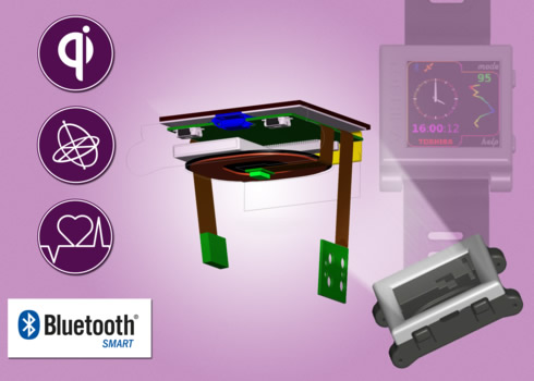 The smartwatch reference model is equipped with a Toshiba Wireless Power Receiver IC TC7764WBG and Toshiba Fast Charger IC TC7710AWBG for quick and simple WPC Qi wireless charging in addition to a micro USB port.