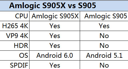 The greatest spotlight of the S905X is that it supports VP9 decoding while the S905 does not. Both of them support H.265 Another one is the price. As a newer model, S905X has better performance, however, the price is same or a little lower. Last, S905X is tailored to Android 6.0, while S905 is for Android 5.1: