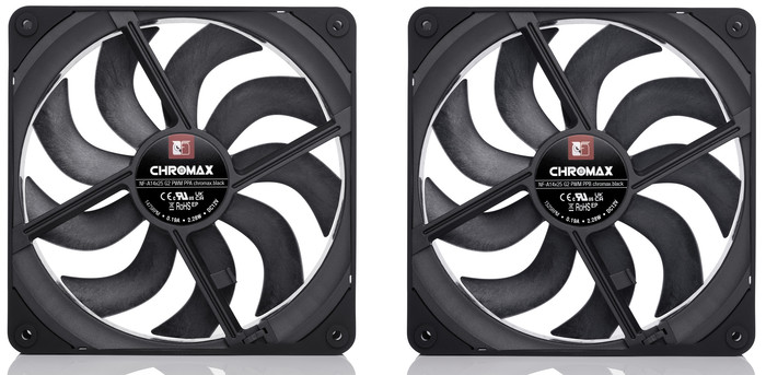 The third Chromax.Black product is the dual setup of 140mm fans, the NF-A14x25 G2 PWM Sx2-PP Chromax.Black. In this product, we will find two 140mm fans that are offset in speed, which can be beneficial in push-pull operation as well as in situations where two or more fans are operating side by side, such as in case cooling applications or on 280mm or 420mm water cooling radiators. Topped off with Noctua’s trusted premium-grade SSO2 bearing, more than 150,000 hours MTTF and a 6-year manufacturer’s warranty, the NF-A14x25 G2 PWM Sx2-PP chromax.black is the perfect choice for users who are looking for a dual 140mm fan set that combines cutting-edge quality, quietness, and performance in an all-black style.