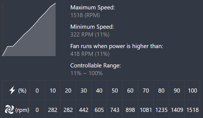 The Asus motherboard showcases its rotation curve with a %10 gap, the 140mm fan will stop at 0% and tops at 1518rpm.