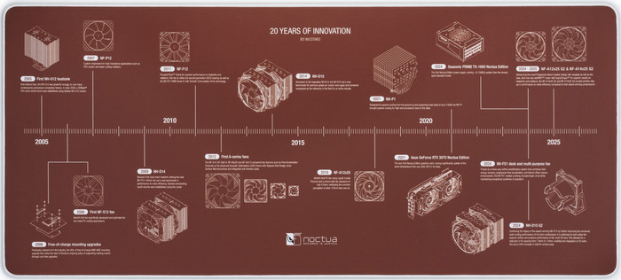 The NP-DM3 depicts key milestones during Noctua’s history of innovation: Starting with the original NH-U12 heatsink and the first-gen NF-S12 fan, it spans a timeline from 2005 over later legends like the NF-P12 and NH-D14 and all the way to today’s G2 models.