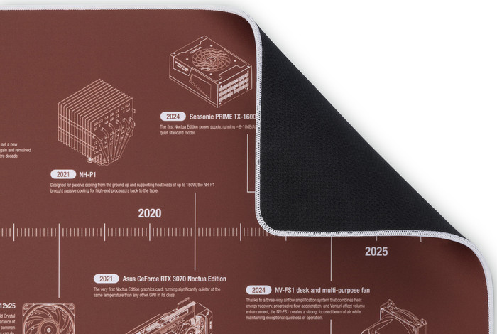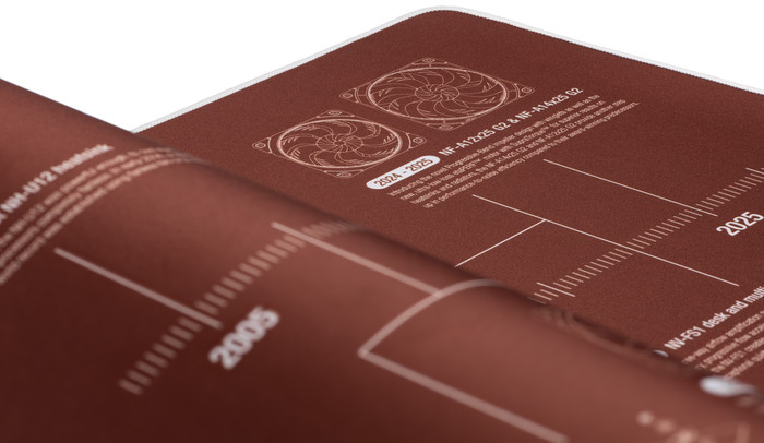 Noctua, apart from the well-known CPU coolers and thermal paste, enters a different arena to "compete" with other manufacturers, but with their own and unique way to present products. The new NP-DM3 desk mat is a 90cm mat that covers your desk and commemorates key milestones in Noctua’s history, from the first NH-U heatsinks and NF-S12 fans to landmark products like the NF-P12 or NH-D14, all the way to the latest G2 models.