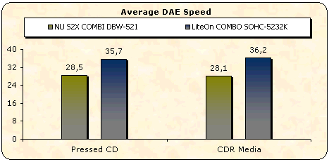 The NU drive supports 40x maximum reading speed for DAE media and uses CAV reading strategy. Nero CDSpeed confirmed these specifications.