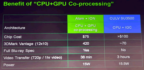 Nvidia claims that the ION platform offers 5 times the performance of an Intel Atom/chipset solution, while it is priced lower and power consumption is not significantly higher.