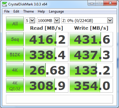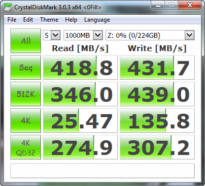 The next benchmark is the CrystalDiskMark. The software provides throughput data based on sequential reads and writes, and random (512K/4K/4KQD32) reads and writes of various sizes.