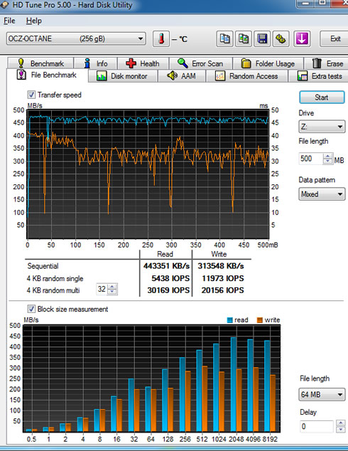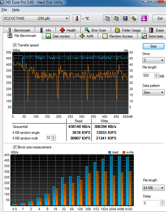 Here is another sequential file test. The SSD's average performance for write was 306.39 MB/s and 438.14 MB/s for read , close to the performance numbers quoted by OCZ. For this test we used the "Zero" data pattern.