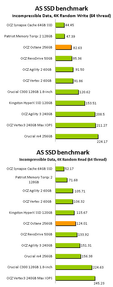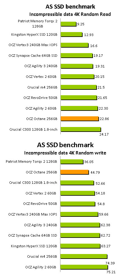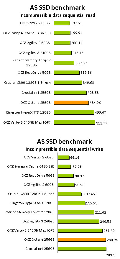 We proceed with the AS SSD benchmark, which contains five synthetic as well as three practical tests. The synthetic tests determine the sequential and the random read / write performance of an SSD. These tests are carried out without using the operating system's cache. The Seq-test measures how long it takes to read and write an 1GB file. Most importantly, this sequential benchmark uses incompressible data for all of its transfers.