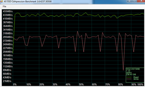 In the following test, the Octane 256GB SSD is reading and writing files, which have been partially of fully compressed. The reading graph is smooth enough showing a consistent performance at around 420 ~ 440 MB/s no matter the compression degree of the files.