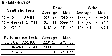 RightMark offers much information about memory modules, combined with some tests. As the synthetic tests showed, OCZ PC2-5400 had the higher reading, while the 2GB of RAM seems to have higher writing performance. During the "Performance Tests", the 2GB PC2-4200 performed better with higher average and max MB/sec.