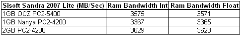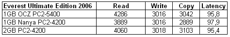 Everest Ultimate Edition 2006 offers many tests, inclujding read/write/copy and latency. The OCZ module had the best read performance, while the 2GB PC2-4200 (OCZ+Nanya), showed better write, copy and lower latency...