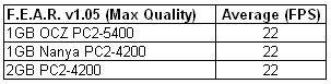 F.E.A.R has one of the most demanding graphic engine. At maximum quality settings, all memory configurations showed equal performance (22FPS average). The 2GB of RAM didn't seemed to affect gaming performance at all.