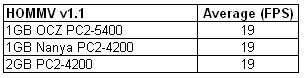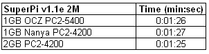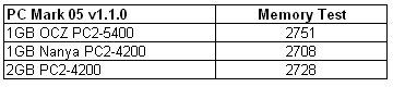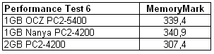 Performance Test 6 includes a MemoryMark that shows the memory's overall performance. The results showed that the stock 1GB Nanya PC-4200 had the best mark, probably due to its lower timings...