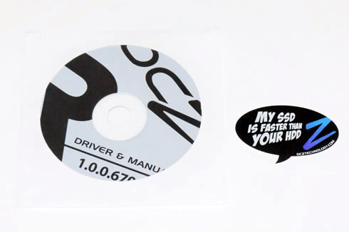 Below you see the familiar retail package of the RevoDrive 3 120GB, also met in other PCIE SSDs of the company. The SSD is well-packaged into the box, in which you will also find a driver/manual CD-ROM and an OCZ sticker: