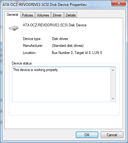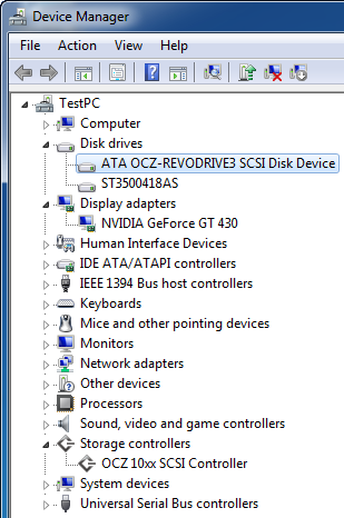 After installation, the SSD appeared under the "Disk drives" in Windows Device Manager. The drive's controller is also appearing under the SCSI controller section as "OCZ 10xx SCSI Controller" :