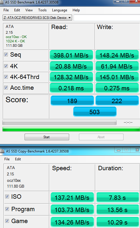The drive's performance in these tests was average, mainly due to the limitations of the SandForce controllers with incompressible data. The RevoDrive 3 120GB produced a good 398.01 MB/s read speed but a slower 148.324 MB/s write performance. The single-threaded 4K IOPS tests showed a high 20.88 MB/s for read and a faster write at 61.94 MB/s write, while the 64-thread 4K reads recorded a good 128.32 MB/s, and the write performance was significantly higher at 145.01MB/s: