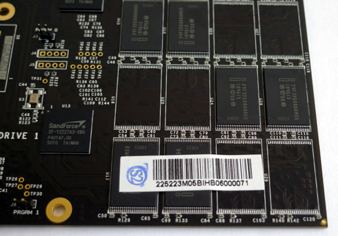 The 50GB RevoDrive we have in our labs has 60GB FLASH NAND on there the PCB spread out over 16 ICs, 8 ICs on each side. As you see in the picture below, there is free space left for more NAND chips on the PCB of the specific model. The same PCB can accommodate more NAND chips and offer higher capacities: